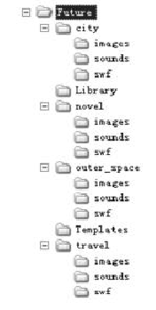 其中,Future為站 點(diǎn)的根文件夾,在根文件夾下根據(jù)網(wǎng)站不同的主題可分為“未來都市”、未來旅游(travel))、未來太空(outer space)、科幻小說(novel)等等欄目,每個(gè)欄目分別對(duì)應(yīng)不同的內(nèi)容。而每個(gè)主題所有文件均放在文件夾中,然后再進(jìn)一步地細(xì)分文件類型