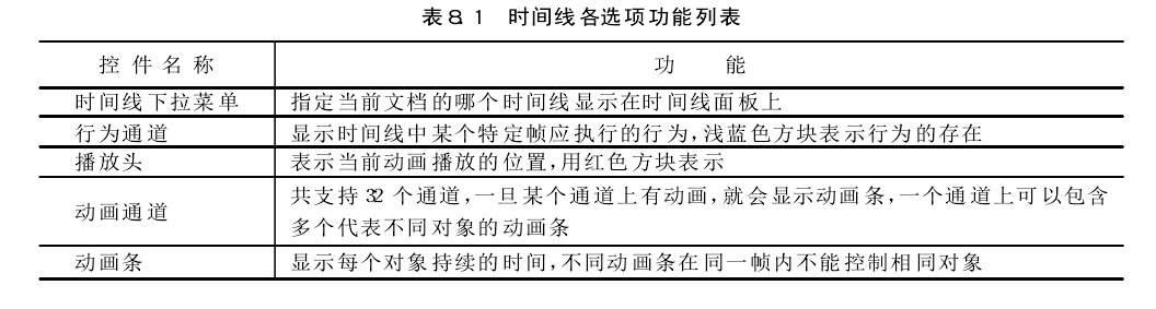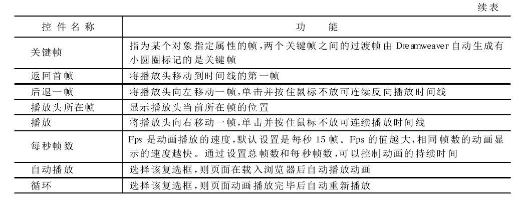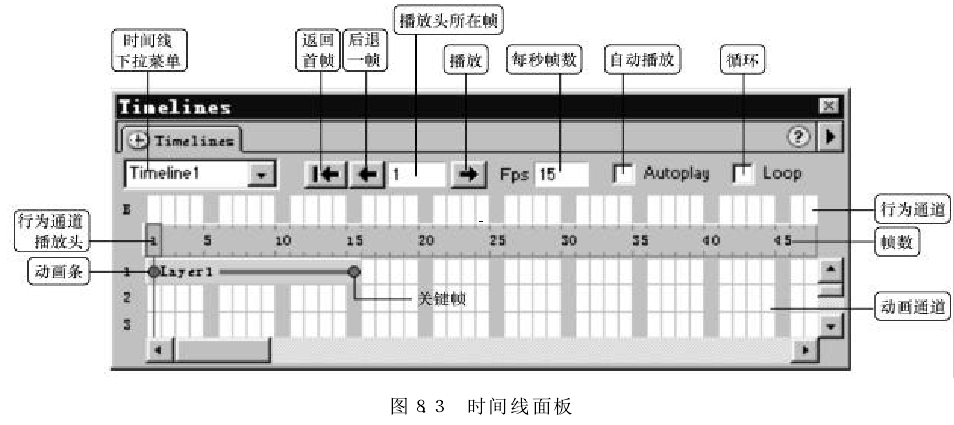 "Timeline(時(shí)間線(xiàn))”面板描繪了層和圖像隨時(shí)間變化的屬性。在菜單欄中選擇“Window" →"Time lines" 命令可打開(kāi)時(shí)間線(xiàn)面板。時(shí)間線(xiàn)面板所包含的控件如圖所示。