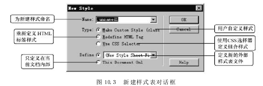 在圖10.3所示"New Style" 對(duì)話框中的“Name”選項(xiàng)中輸入樣式名稱.my-css-1”。在"Define"選項(xiàng)組中選擇 "This Document Only" 單選項(xiàng),單擊"OK"按鈕。