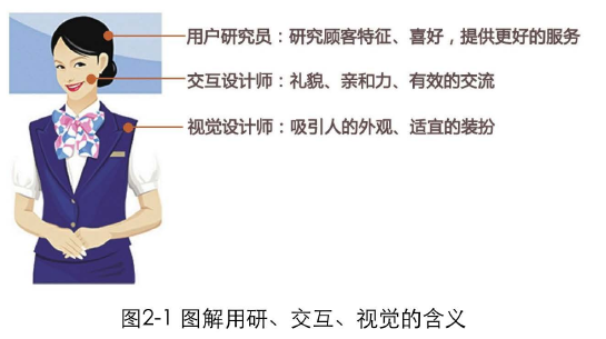 好的用戶體驗(yàn),就如同彬彬有禮的服務(wù)人員,不但能馬上解決用戶的問題,其優(yōu)美的談吐、機(jī)智的反應(yīng),也會(huì)給用戶一次非常美妙的體驗(yàn)。如果把產(chǎn)品比做圖2-1左側(cè)的這個(gè)服務(wù)人員,那么這3個(gè)職位的作用正如圖中所描述的那樣。