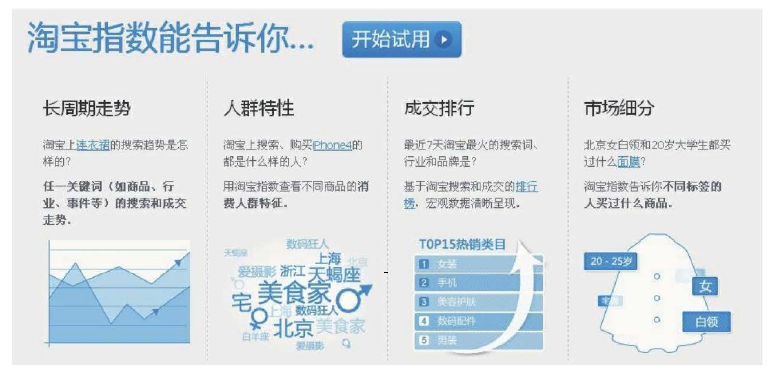 還可以試試百度指數(shù)、淘寶指數(shù)等工具,它們可以告訴你目前的搜索熱詞、搜索詞對應(yīng)的用戶特征、各項(xiàng)數(shù)據(jù)指標(biāo)等,非常實(shí)用,如圖5-6所示。