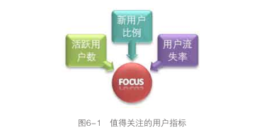 從上面可以看出,我們在獲得訪問用戶數(shù)、新用戶數(shù)、活躍用戶數(shù)、流失用戶數(shù)、回訪用戶數(shù)的同時,通過計算還得到了老用戶數(shù)、留存用戶數(shù)等衍生用戶指標(biāo),同時得到了新用戶比例、活躍用戶比例、用戶流失率、用戶訪問率等復(fù)合指標(biāo)。這些指標(biāo)給我們的分析提供了足夠的支持,而且指標(biāo)的定義相對明確,有各自的應(yīng)用價值,不會存在相互重復(fù)或重疊的部分,類似這樣的網(wǎng)站用戶指標(biāo)體系是比較完整和規(guī)范的。至于上面提到的其他用戶指標(biāo),也許在某些時候基于某些分析才會用到,一般不需要作為 日常指標(biāo),可以使用臨時統(tǒng)計或者從其他數(shù)據(jù)中間接獲取。 當(dāng)我們已經(jīng)定義了一套適合分析用戶的指標(biāo)體系之后,可以看一下哪些指標(biāo)值得重點去關(guān)注,這個時候可以設(shè)想一下 : 如果你想用盡量簡潔有效的數(shù)據(jù)了解一個網(wǎng)站或產(chǎn)品的用戶情況, 你會問哪幾個用戶數(shù)據(jù)? 如果是我提問,我只會問三個指標(biāo):活躍用戶數(shù)、新用戶比例和用戶流失率,如圖6-1所示。