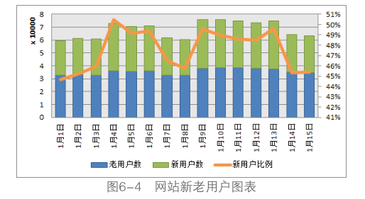 如圖6-4所示,可以用柱狀堆積圖顯示新用戶和老用戶的數(shù)量變化,堆積的結(jié)果就是網(wǎng)站總用戶數(shù)量的變化,結(jié)合新用戶比例的折線,通過(guò)分析網(wǎng)站新用戶的數(shù)量和比例的變化能夠直接反映網(wǎng)站在營(yíng)銷(xiāo)推廣上的效果。