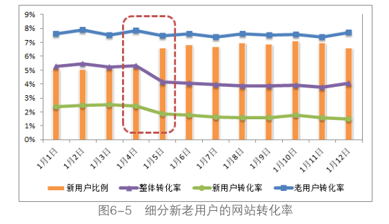 對(duì)于新用戶的分析可以掌握網(wǎng)站的發(fā)展?fàn)顩r,但網(wǎng)站的根基在于老用戶,所以有時(shí)候需要單獨(dú)分析老用戶的數(shù)據(jù)。之前遇到過(guò)一個(gè)問(wèn)題: 網(wǎng)站經(jīng)常會(huì)通過(guò)一些推廣策略吸引流量,這些推廣可能會(huì)吸引一些新用戶的加入,新用戶比例會(huì)隨之上升,網(wǎng)站的轉(zhuǎn)化率卻在逐漸下降。所以網(wǎng)站的運(yùn)營(yíng)人員需要明確轉(zhuǎn)化率的下降是因?yàn)榫W(wǎng)站本神原因造成的,還是因?yàn)樾掠脩舯壤脑黾永土苏w轉(zhuǎn)化率、轉(zhuǎn)化率一直是網(wǎng)站中比較敏感的一個(gè)指標(biāo),因?yàn)橹苯雨P(guān)系到目標(biāo)和績(jī)效,如果證明轉(zhuǎn)化率的下降不是由于推廣導(dǎo)致的,而是網(wǎng)站運(yùn)營(yíng)的問(wèn)題,那么運(yùn)營(yíng)人員顯然需要盡快尋找和解決問(wèn)題。所以這里就需要區(qū)分新老用戶的轉(zhuǎn)化率,網(wǎng)站推廣帶來(lái)新用戶,新用戶的轉(zhuǎn)化率不高可以理解,如果新用戶的比例持續(xù)上升,轉(zhuǎn)化率的下降就會(huì)被持續(xù)拉低,相對(duì)而言,網(wǎng)站的老用戶是基本穩(wěn)定的,而且如果網(wǎng)站自身沒(méi)有發(fā)生問(wèn)題,老用戶的轉(zhuǎn)化率也應(yīng)該保持穩(wěn)定,細(xì)分新老用戶統(tǒng)計(jì)轉(zhuǎn)化率能夠幫助我們回答這個(gè)問(wèn)題,如圖6-5所示。