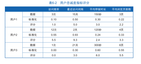 表6-2中,用戶忠誠度的4個分析指標(biāo)經(jīng)過標(biāo)準(zhǔn)化處理后統(tǒng)一以10分制的形式輸出,這樣就能直接區(qū)分每個用戶的每項指標(biāo)的表現(xiàn)好壞?;诿總€指標(biāo)的評分,可以對用戶進(jìn)行篩選,比如營銷部門重點跟進(jìn)經(jīng)常訪問網(wǎng)站的用戶,可以選擇訪問頻率評分大于3分的用戶,或者重點跟進(jìn)用戶訪問參與度較高的用戶,可以篩選平均停留時間和平均訪問頁面數(shù)都大于3分的用戶,這樣能夠幫助營銷部門迅速定位忠誠用戶。