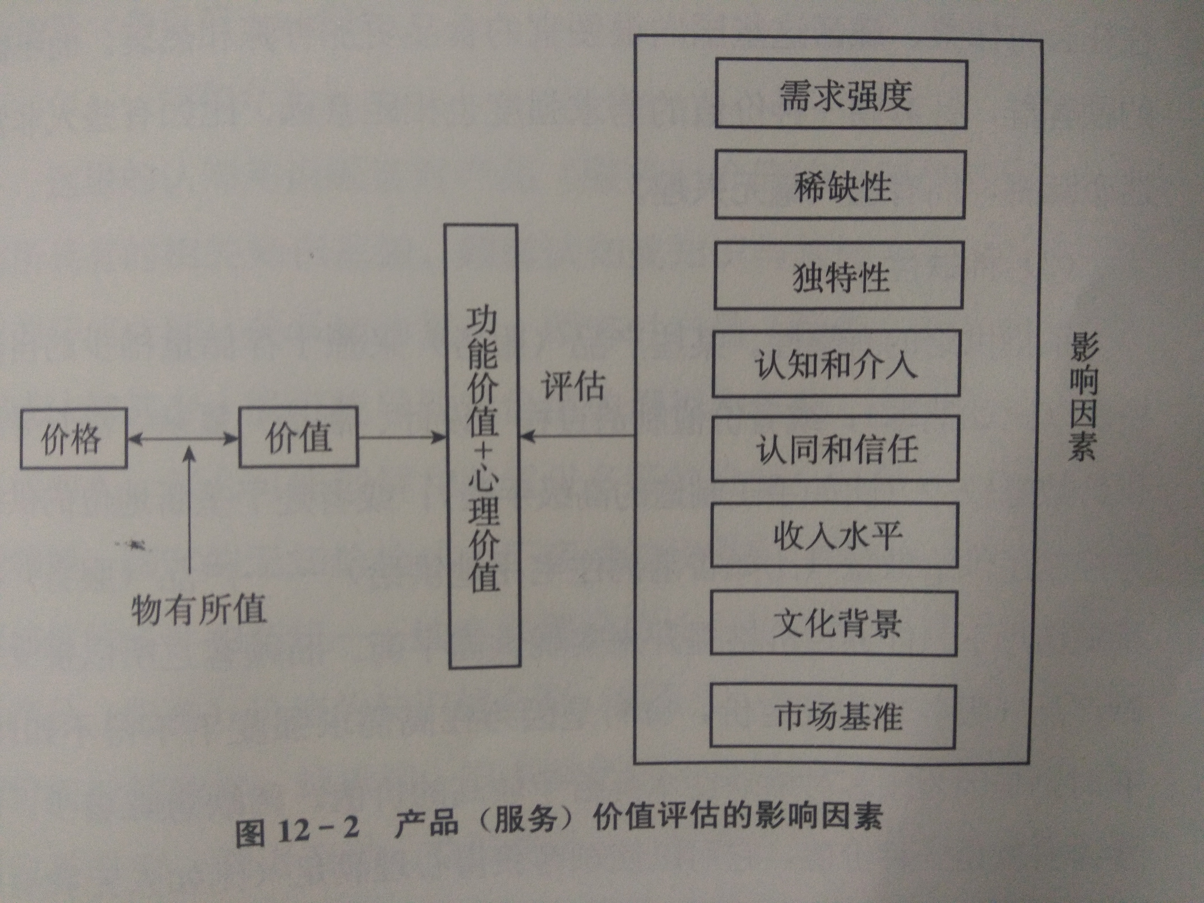 讀者朋友可能會(huì)問(wèn):顧客如何評(píng)估產(chǎn)品(服務(wù))的價(jià)值?他們會(huì)考慮哪些變量? 他們會(huì)受哪些因素影響?下面我們一一說(shuō)明(見(jiàn)圖12-2)。