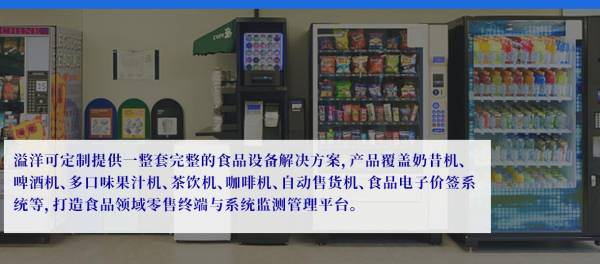 溢洋可定制提供一整套完整的食品設(shè)備解決方案,產(chǎn)品覆蓋奶昔機(jī)、啤酒機(jī)、多口味果汁機(jī)、茶飲機(jī)、咖啡機(jī)、自動(dòng)售貨機(jī)、食品電子價(jià)簽系統(tǒng)等,打造食品領(lǐng)域零售終端與系統(tǒng)監(jiān)測(cè)管理平臺(tái)。