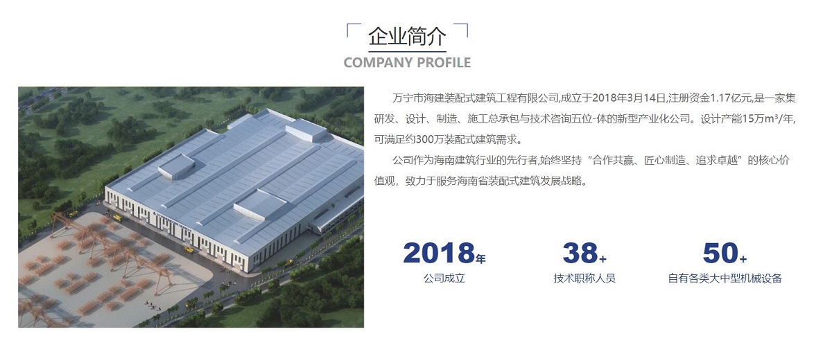 萬寧市海建裝配式建筑工程有限公司,成立于2018年3月14日,注冊(cè)資金1.17億元,是一家集研發(fā)、設(shè)計(jì)、制造、施工總承包與技術(shù)咨詢五位-體的新型產(chǎn)業(yè)化公司。設(shè)計(jì)產(chǎn)能15萬m³/年,可滿足約300萬裝配式建筑需求。
