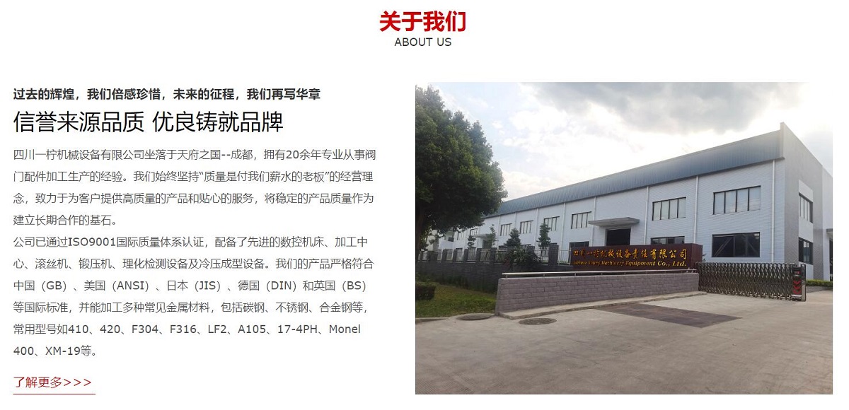 四川一檸機械設(shè)備有限公司坐落于天府之國--成都,擁有20余年專業(yè)從事閥門配件加工生產(chǎn)的經(jīng)驗。我們始終堅持“質(zhì)量是付我們薪水的老板”的經(jīng)營理念,致力于為客戶提供高質(zhì)量的產(chǎn)品和貼心的服務(wù),將穩(wěn)定的產(chǎn)品質(zhì)量作為建立長期合作的基石。