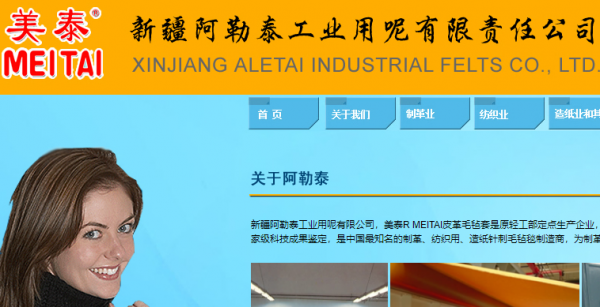 新疆阿勒泰工業(yè)用呢有限責(zé)任公司,成立于1966年,是原輕工部定點(diǎn)生產(chǎn)皮革毛氈套企業(yè),先后多次承擔(dān)省部級(jí)科技創(chuàng)新項(xiàng)目,在皮革、紡織印染、造紙行業(yè)等多項(xiàng)科技成果通過(guò)國(guó)家級(jí)科技成果鑒定,是中國(guó)最知名的針刺毛氈套制造商,為制革、紡織、造紙廠商提供50多種不同型號(hào)、用途的皮革毛氈套、預(yù)縮加厚呢毯、造紙毛毯。美泰 MEITAI 氈毯直接服務(wù)客戶,2012年獲中國(guó)紡織科技進(jìn)步二等獎(jiǎng),2013年獲全國(guó)工商聯(lián)科技進(jìn)步優(yōu)秀獎(jiǎng)。產(chǎn)品替代進(jìn)口,填補(bǔ)國(guó)內(nèi)空白,整體技術(shù)與產(chǎn)品綜合性能達(dá)到國(guó)際先進(jìn)水平。產(chǎn)品遠(yuǎn)銷(xiāo)國(guó)內(nèi)二十多個(gè)省市自治區(qū),并出口歐亞、非洲、美洲國(guó)際市場(chǎng)。