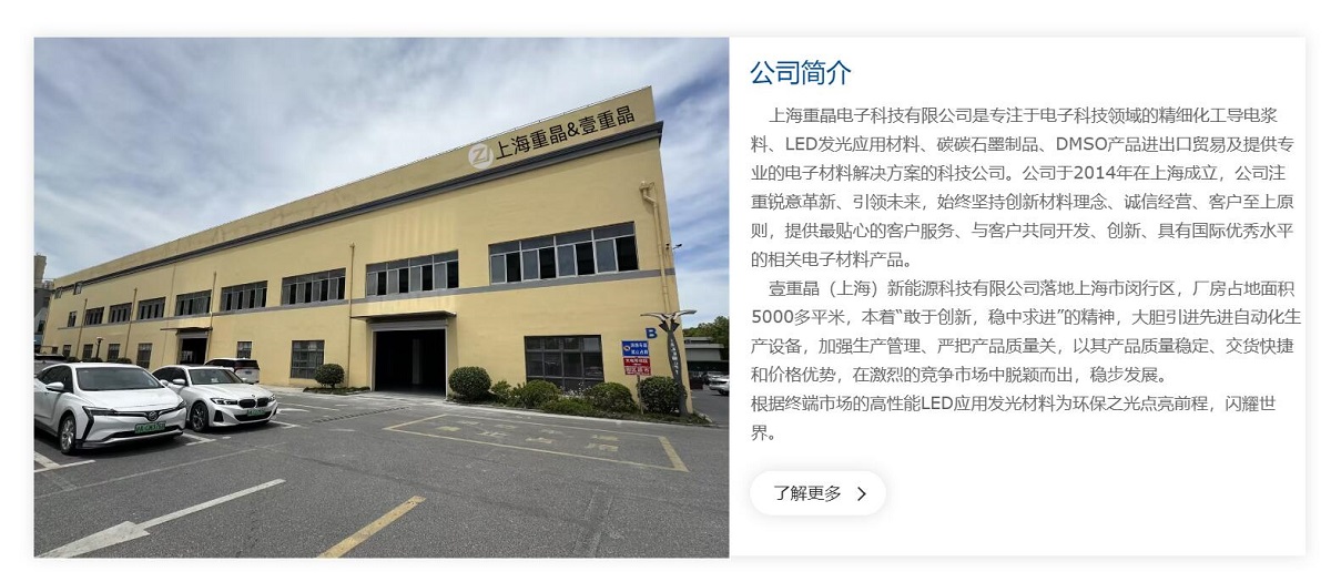 上海重晶電子科技有限公司是專注于電子科技領(lǐng)域的精細(xì)化工導(dǎo)電漿料、LED發(fā)光應(yīng)用材料、碳碳石墨制品、DMSO產(chǎn)品進(jìn)出口貿(mào)易及提供專業(yè)的電子材料解決方案的科技公司。公司于2014年在上海成立,公司注重銳意革新、引領(lǐng)未來,始終堅(jiān)持創(chuàng)新材料理念、誠信經(jīng)營、客戶至上原則,提供最貼心的客戶服務(wù)、與客戶共同開發(fā)、創(chuàng)新、具有國際優(yōu)秀水平的相關(guān)電子材料產(chǎn)品。