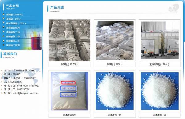 公司主要生產亞磷酸和亞磷酸鹽系列,其中主要產品亞磷酸,年產量達10000噸。我們與國內50多家外貿公司合作,同時還自營出口。95%的高品質亞磷酸產銷美國,英國,法國,德國,日本,韓國,加拿大,巴西,阿根廷,澳大利亞等國家。