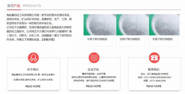 海鹽睿*化工科技有限公司選用我司企業(yè)化工原料行業(yè)的網(wǎng)站優(yōu)化產(chǎn)品,其SEO關鍵詞有 嘉興污水絮凝劑,嘉興污水處理廠,嘉興聚丙烯酰胺廠家,海鹽污水絮凝劑,海鹽污水處理廠,造紙化學品廠家,礦山凈水劑,洗沙凈水劑。其特點是用很合適的展示方式、展示效果、站點框架,把客戶及其用戶很關心的問題突出表現(xiàn);并以簡潔明朗的設計風格,清晰展現(xiàn)公司水平實力,確保一秒抓住目標用戶眼球,給用戶留下良好的第一印象。海鹽睿*化工科技有限公司成立于2012年,是經(jīng)海鹽市市場監(jiān)督管理局審核的有資質的公司,其統(tǒng)一社會信用代碼:91330424**289801X8。公司地址:浙江省海鹽縣大橋新區(qū)。