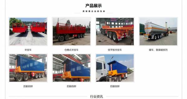 目前我公司生產(chǎn)集裝箱平板半掛車、集裝箱運輸車、主車、半掛自卸車、各種系列半掛車、全掛車、廂式貨車、車輛運輸車、上海50掛、天津60掛車,車輛噸位從8噸*60噸不等,產(chǎn)品種類有40多種,并承接專用車及**車輛的改裝設(shè)計業(yè)務(wù)。采用新技術(shù)、新工藝、新材料,及時聽取市場反饋,快速把握市場先機,勇于創(chuàng)新,專用掛車經(jīng)過較近幾年的突破性發(fā)展,成為公司主流、主導(dǎo)產(chǎn)品,銷售量每年都以90%以上的速度遞增,在全國同行業(yè)中銷售排名前列。