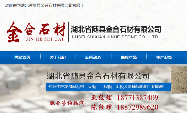 湖北省隨縣金合石材有限公司選用我司企業(yè)寵物用品網(wǎng)站案例,其網(wǎng)站建設(shè)的特點(diǎn)是石材銷售。360度立體式展現(xiàn)產(chǎn)品信息,提供基于用戶了解產(chǎn)品細(xì)節(jié)信息、試用體驗(yàn)產(chǎn)品、運(yùn)用產(chǎn)品于場景的全方位展示解決方案,讓用戶更全面更直觀了解產(chǎn)品,幫助他們選擇最合適的影音產(chǎn)品,創(chuàng)造更美好的生活。湖北省隨縣金合石材有限公司成立于2006年,是經(jīng)隨州市場監(jiān)督管理局審核的有資質(zhì)的公司,其統(tǒng)一社會(huì)信用代碼:91421321MA48YH1J5B。公司地址: 隨縣吳山鎮(zhèn)星火村一組。